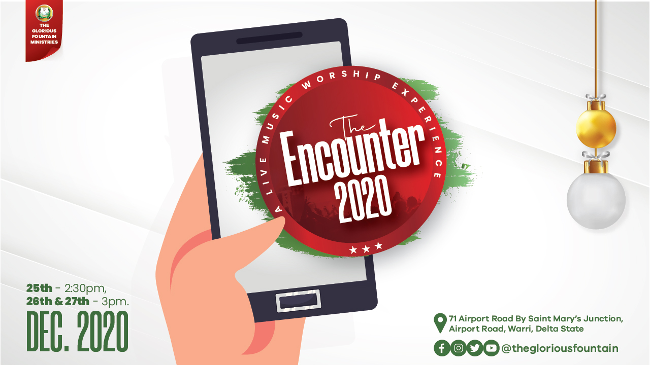 The Encounter 2020 is upon us and this time, it's happening on Christmas day so we gather tomorrow 25th December 2020 to celebrate our King @The City of Refuge (Home of The Glorious Fountain Ministries). Join us live or connect with us via zoom as Min. Afi Douglas, Freke Umoh, Footprint5 Rock, Rev. Andrew Esemudje, Min. Gboyega Sax, Rev Gweke Ikoge, Pastor Jamis Jakes, Pastor Onos, Rev. Igho and The Glorious Fountain Choir lead us by the spirit in a wonderful time of worship to God.